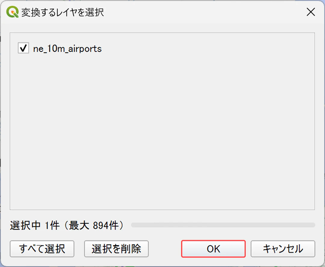 マップ内にローカルのベクターレイヤーがある場合は、Kumoyのベクターに変換するレイヤーを選ぶ画面が表示されます。変換したいレイヤーにチェックを入れて[OK]をクリックしてください。