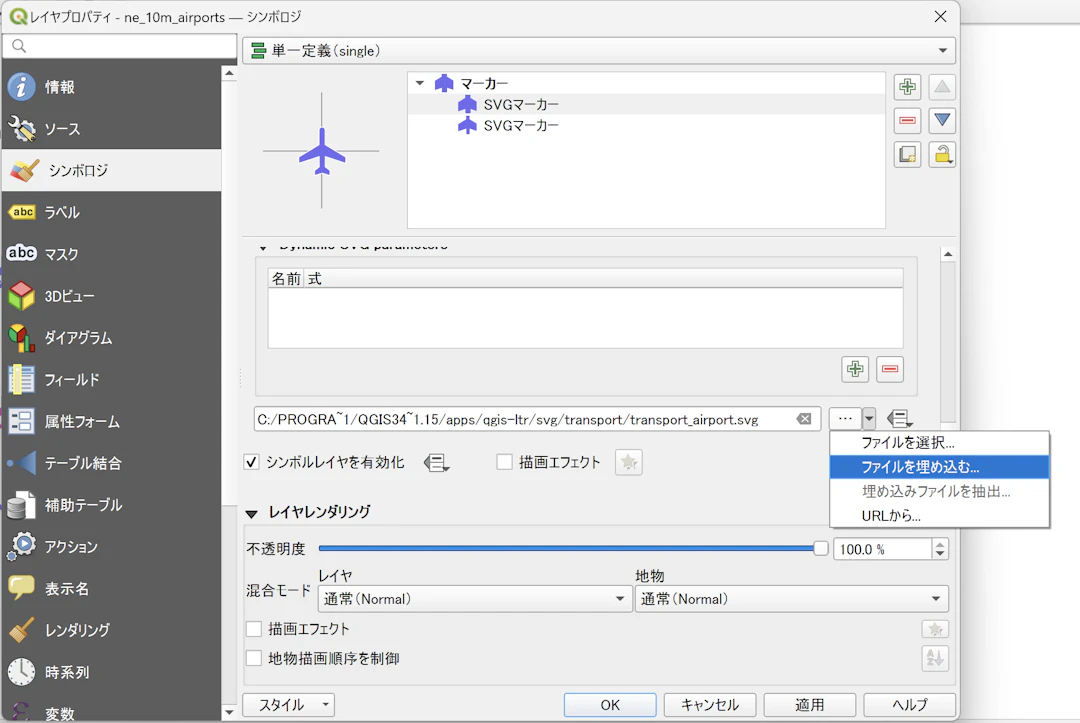 ローカルに保存されているラスター画像やSVGをアイコンとして使用している場合は、QGISのシンボル設定の「ファイル埋め込む」からアイコンを設定し、プロジェクトファイルに保存しておくことが重要です。