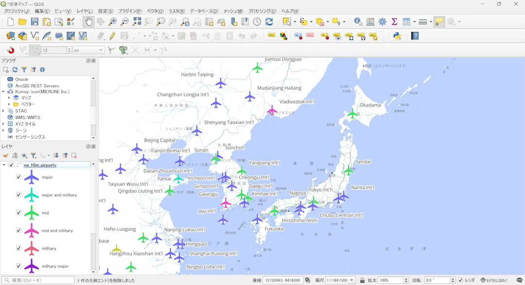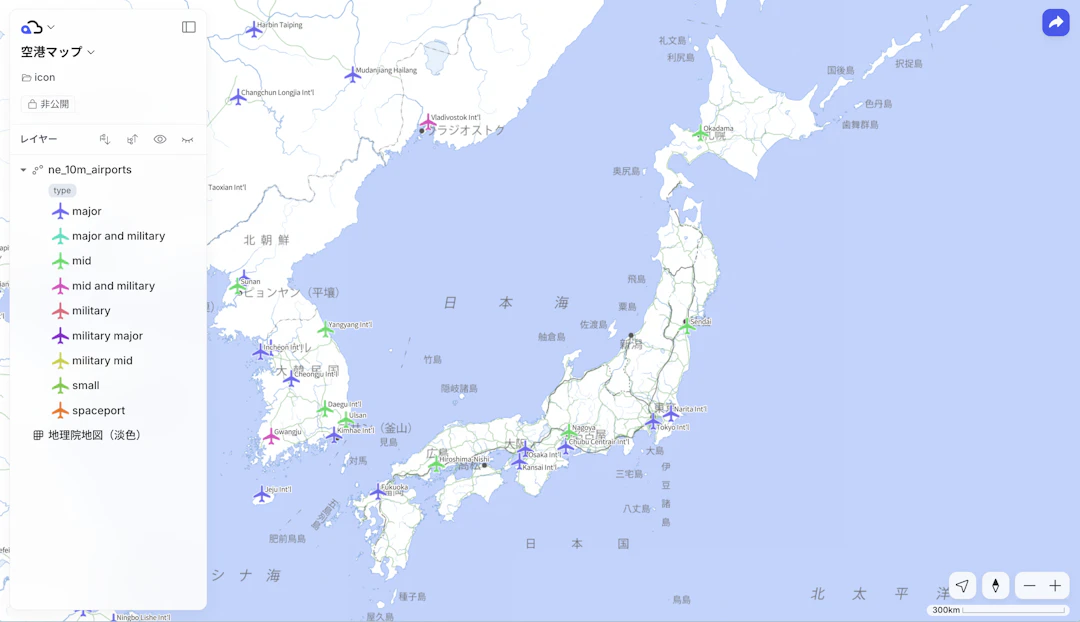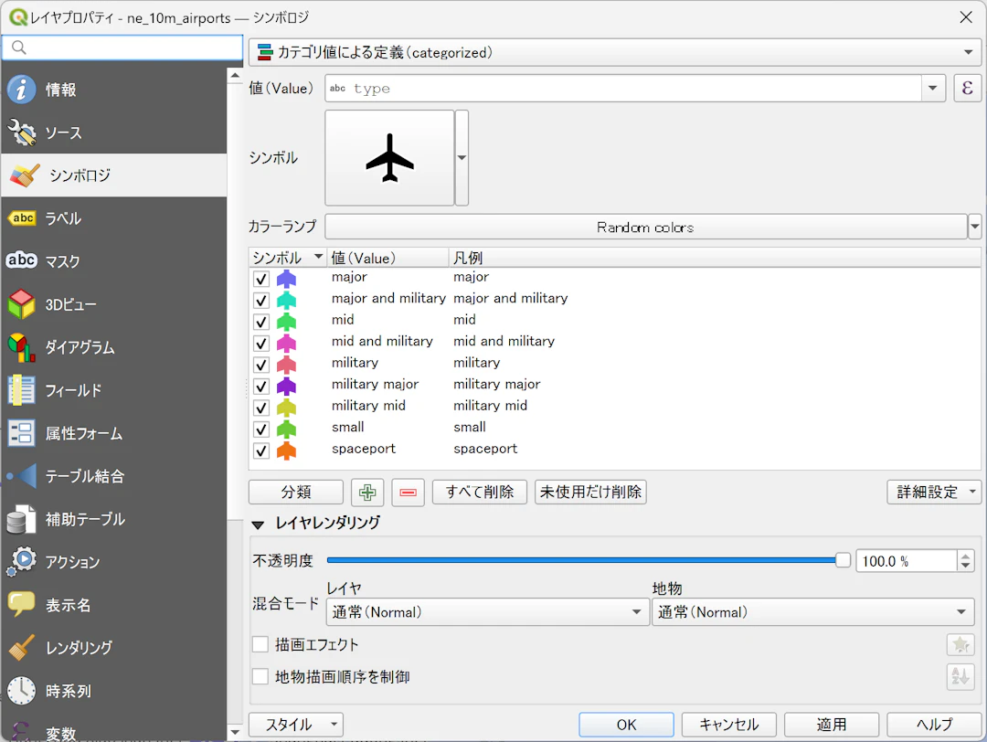 まずはQGISで、ポイントレイヤーのシンボルとしてラスター画像アイコンやSVGアイコンを設定します。今回は、Natural Earthからダウンロードした世界の空港データを使い、空港の種別(type)ごとにカテゴリ値でスタイリングして、飛行機のアイコンをシンボルとして設定しました。