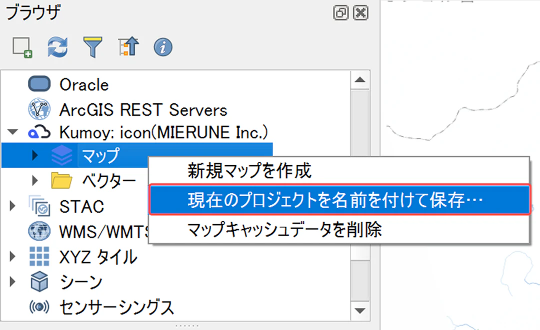 アイコンを設定した地図をKumoyに保存・アップロードします。ブラウザパネルで[Kumoy]→[マップ]を右クリックし、[現在のプロジェクトを名前を付けて保存]をクリックしましょう。